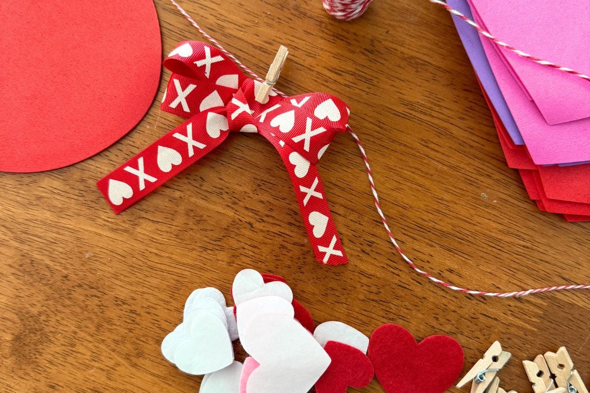 Cut short pieces of ribbon and either tie a bow or pinch the center and clip it with a clothespin. Clip the bows onto the twine wherever you want a little extra detail.