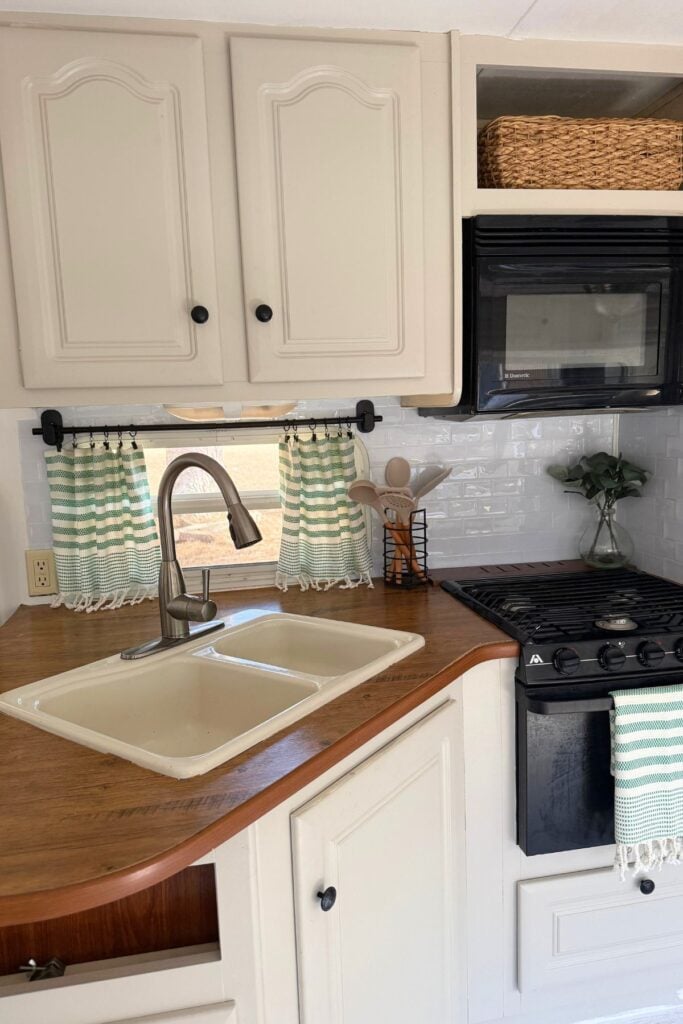 So far, I’ve painted the cabinets, added a peel-and-stick backsplash and contact paper to the counters, removed the old valance and blinds, and installed the new camper curtains.