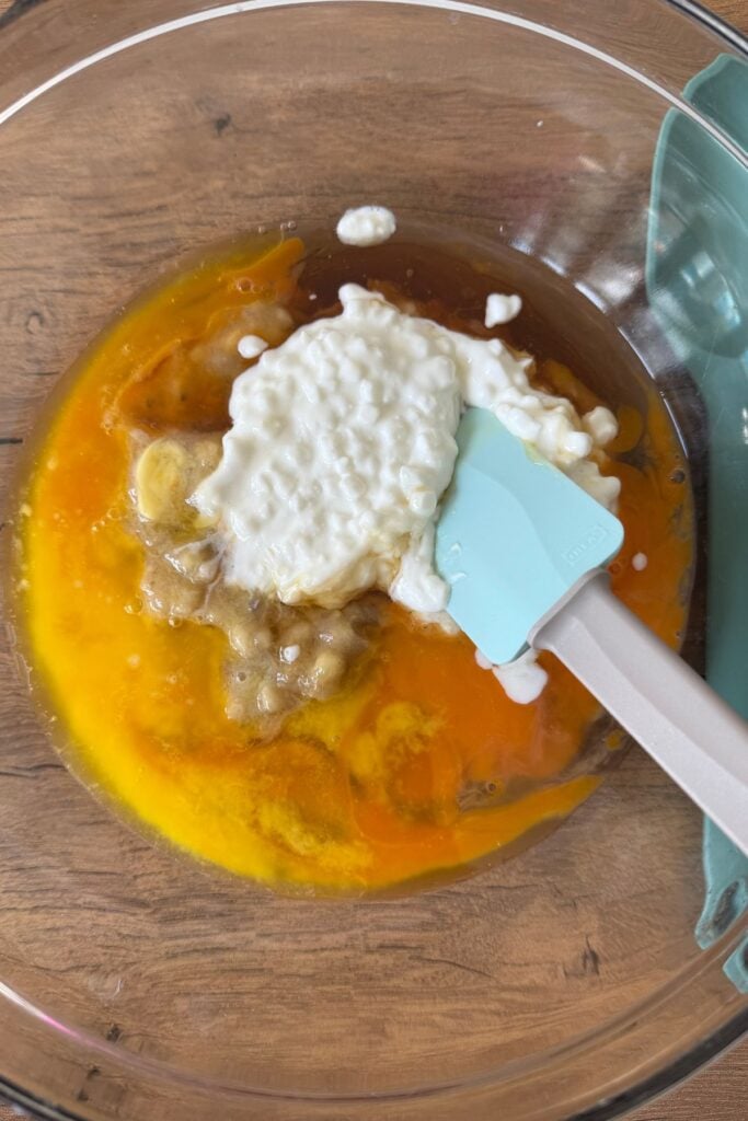 - Mix wet ingredients – In a large bowl, mash bananas. Whisk in eggs, melted butter, honey (or other sweetener), cottage cheese (or Greek yogurt), and vanilla until smooth.