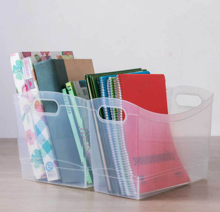 These Sterilite bins are a little more narrow but still have the same great shape and are clear, without a lid: