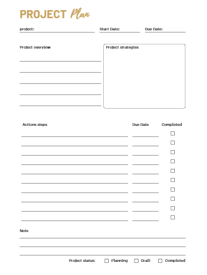 - Project Plan – start/due dates, overview, strategies, action steps, and status.