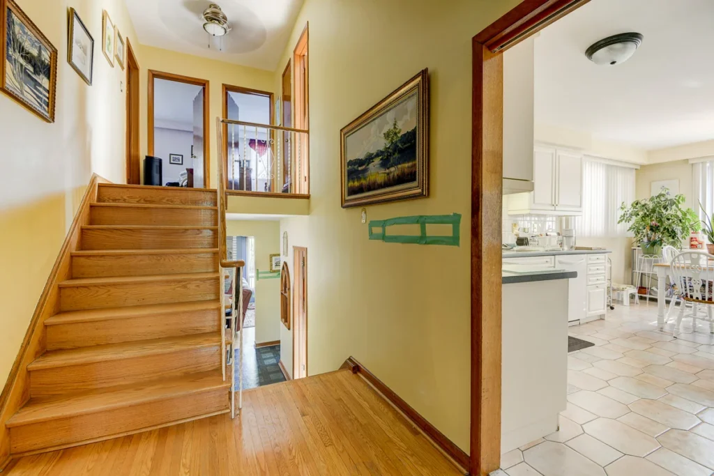 Rather than taking down the wall between the staircases and the kitchen, the builder widened the doorway to give a more open feel into the kitchen while retaining the structure.